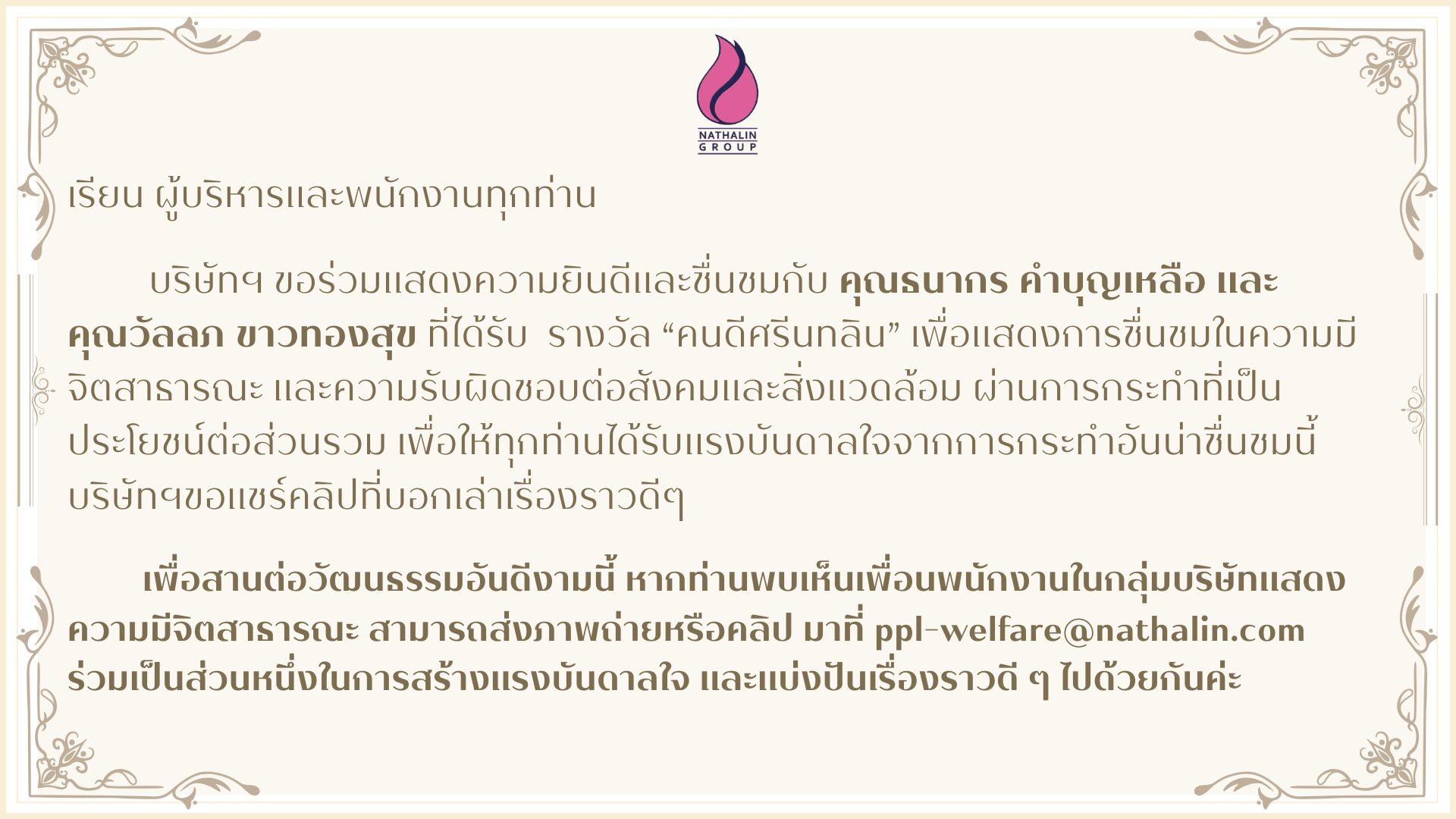 20 February ประกาศนียบัตรเชิดชูเกียรติ “คนดีศรีนทลิน” แก่พนักงานผู้ให้การช่วยเหลือปฐมพยาบาลแก่บุคคลภายนอกบริษัท ข่าวสารและกิจกรรม