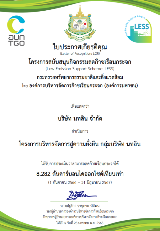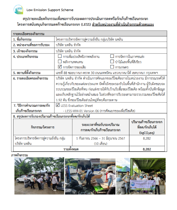 บริษัท นทลิน จำกัด ดำเนินการคัดแยกขยะรีไซเคิลภายในหน่วยงาน มีการรณรงค์ให้ความรู้เกี่ยวกับขยะแต่ละประเภท จัดตั้งถังขยะรองรับในพื้นที่สำนักงาน ผู้รับผิดชอบจะรวบรวมขยะรึไซเคิลที่พบ ก่อนส่งขายให้กับร้านรับซื้อขยะรีไซเคิล พร้อมทั้งบันทึกข้อมูลและเก็บหลักฐานไว้อย่างสม่ำเสมอ ในช่วงที่ขอการรับรองสามารถรวบรวมขยะรีไซเคิลได้ 1.92 ตัน ซึ่งขยะฯส่วนใหญ่ที่พบคือกระดาษ